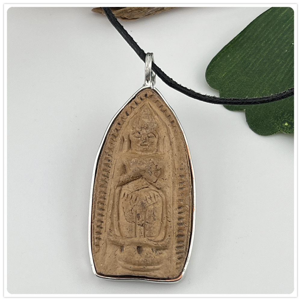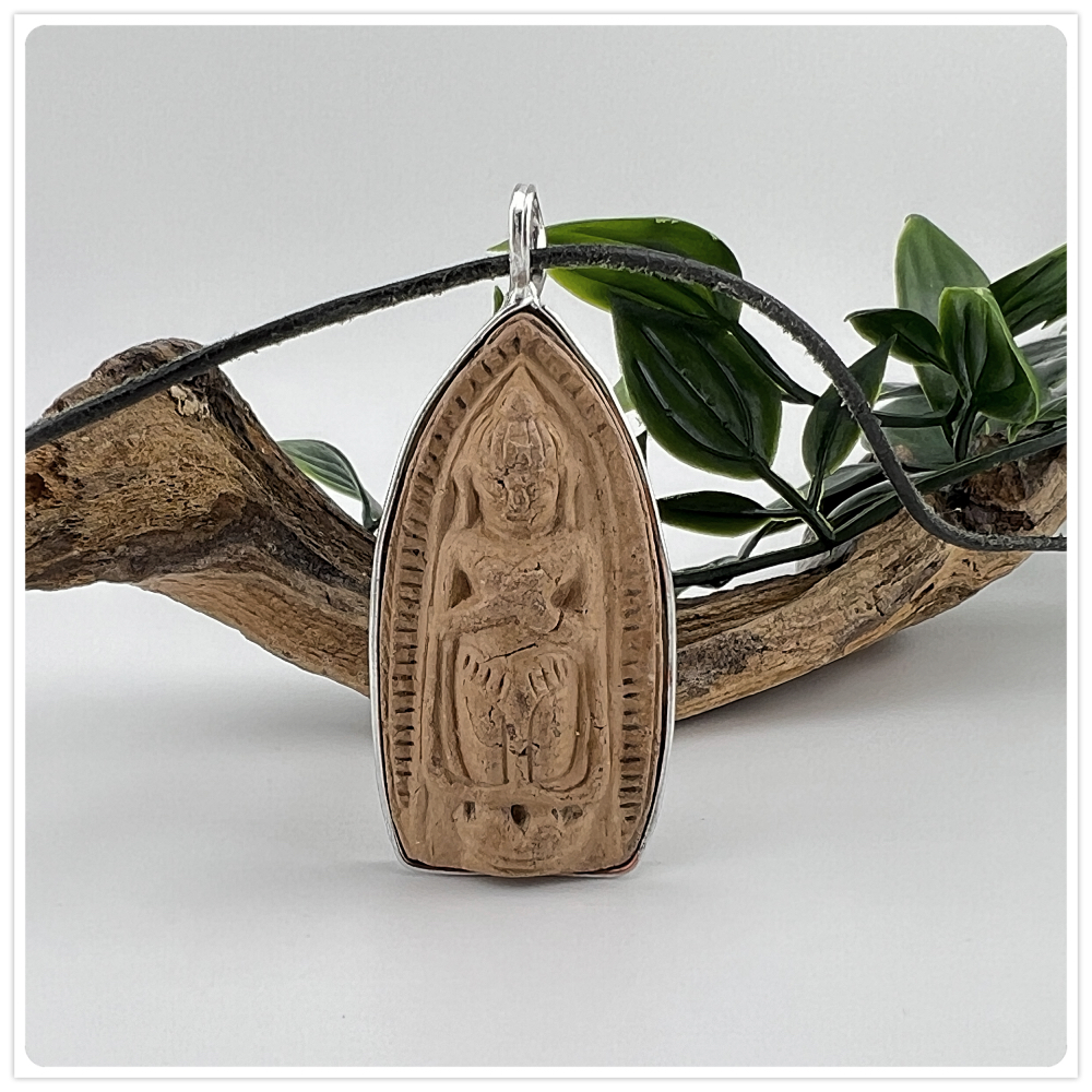 Das Amulett ist aus fein verarbeitetem Art-Ton gefertigt und folgt der reduzierten, stilisierten Formensprache thailändischer Amulettkunst.